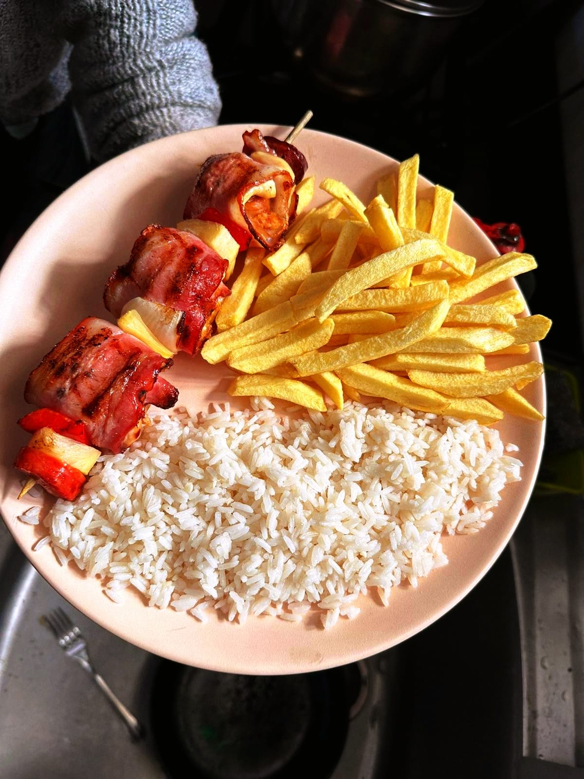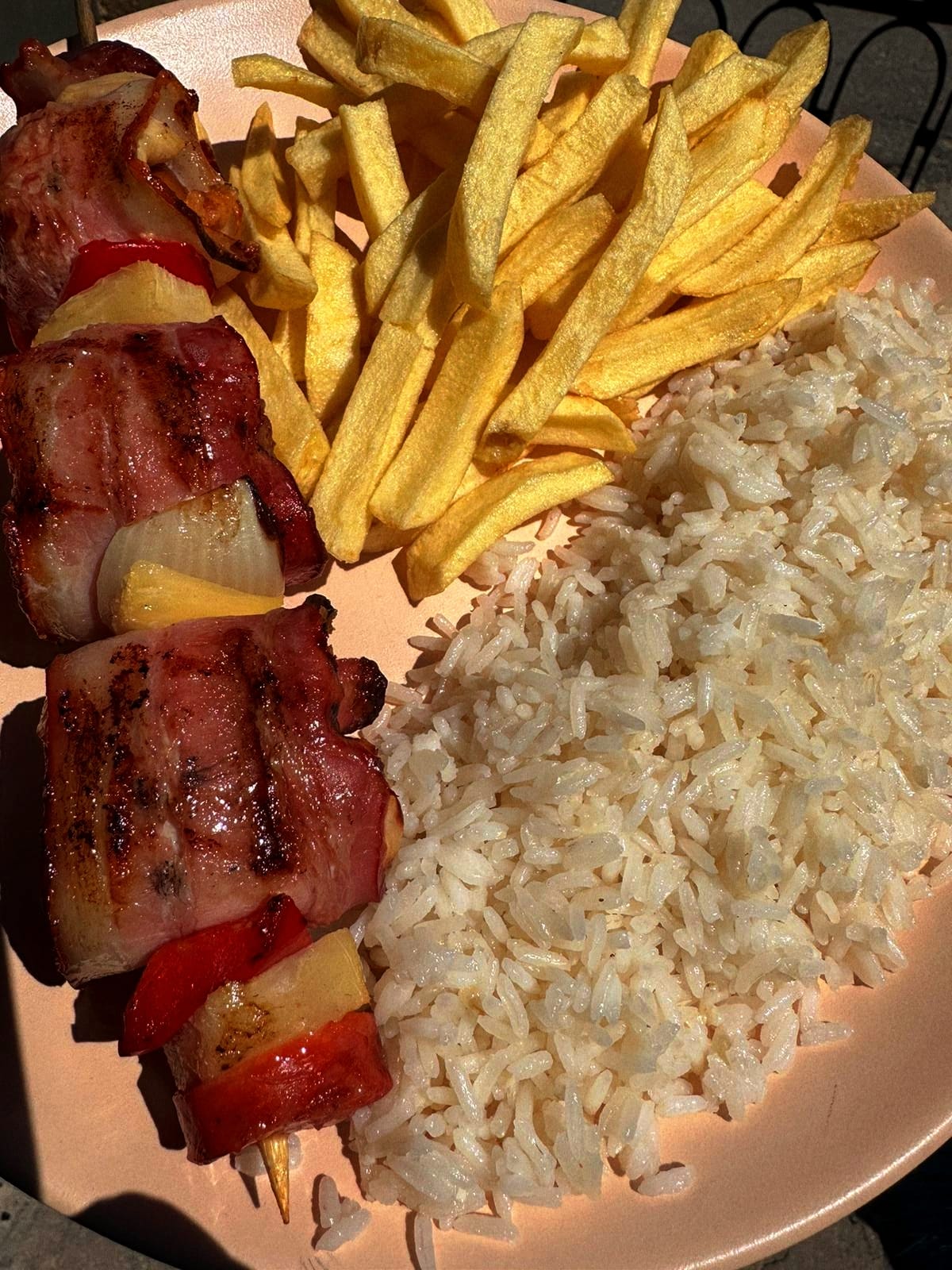 2 espetadas de frango com bacon, arroz, feijão e batata frita