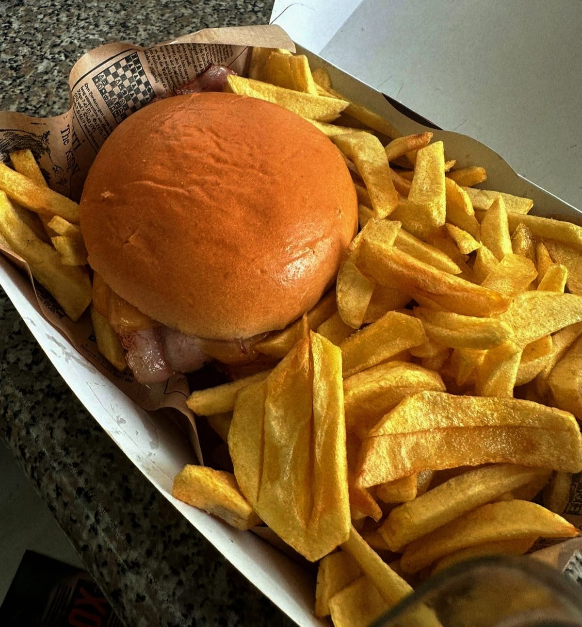 Pão, carne, bacon, queijo + batata frita