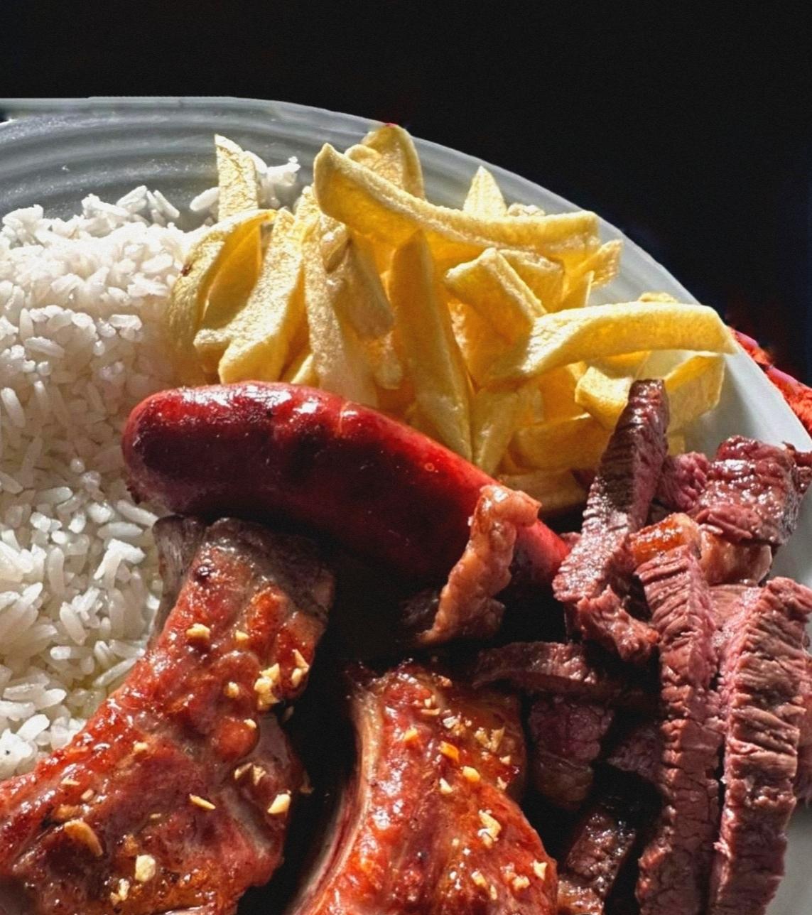 Picanha, entrecosto, salsicha, arroz, batata frita e feijão